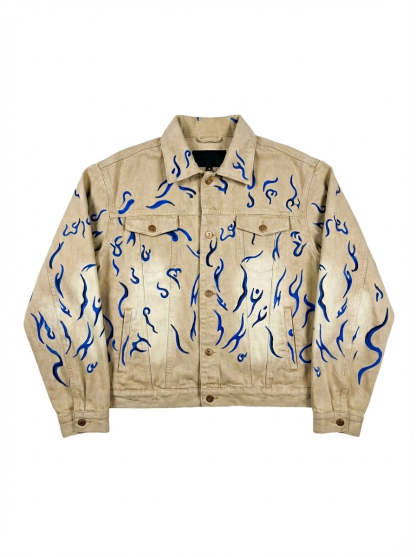 Beige washed denim jacket and pants featuring blue embroidered designs across the entire set for bold contrast and texture. Finished with custom golden buttons that elevate the piece with a premium touch. A statement denim set blending vintage wash with detailed embroidery.