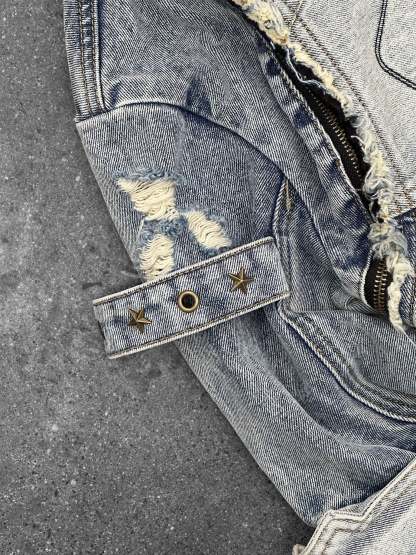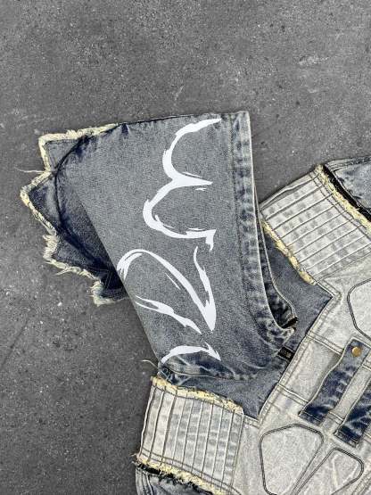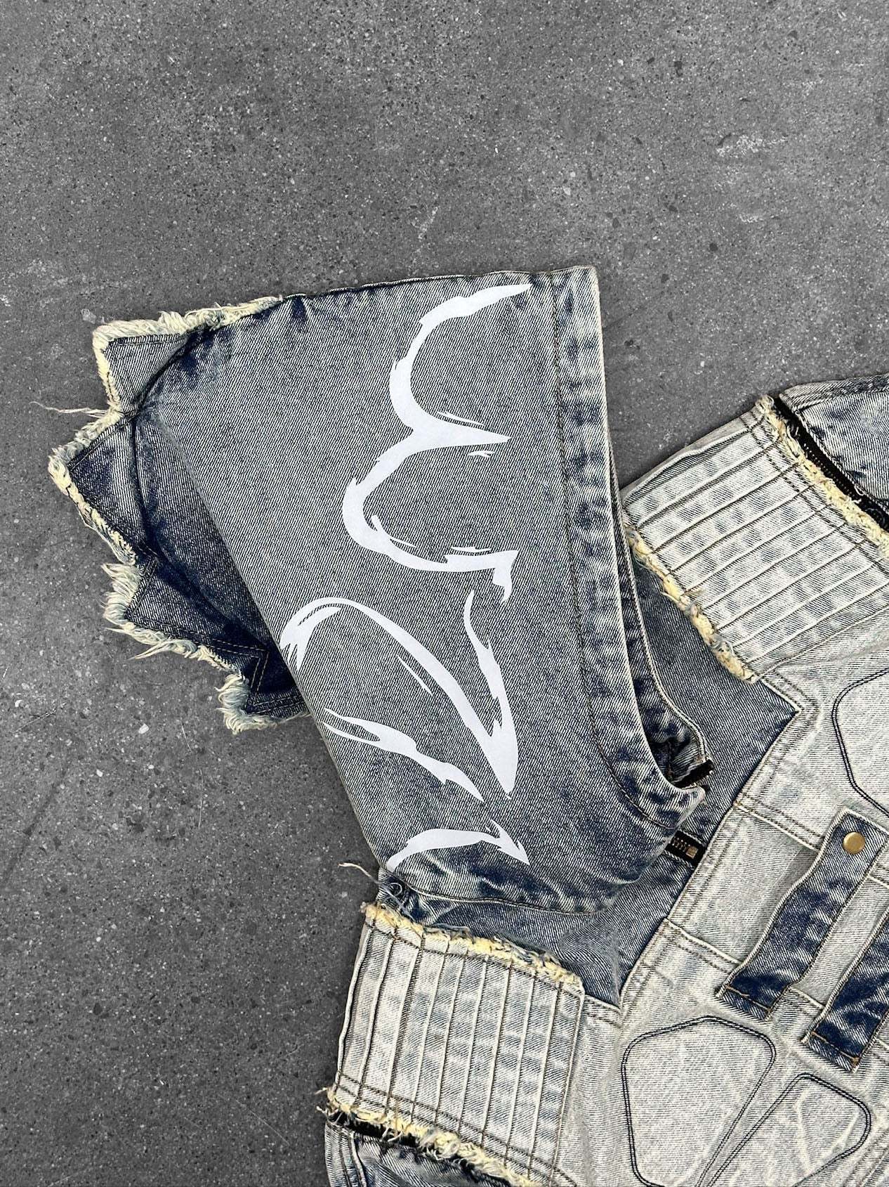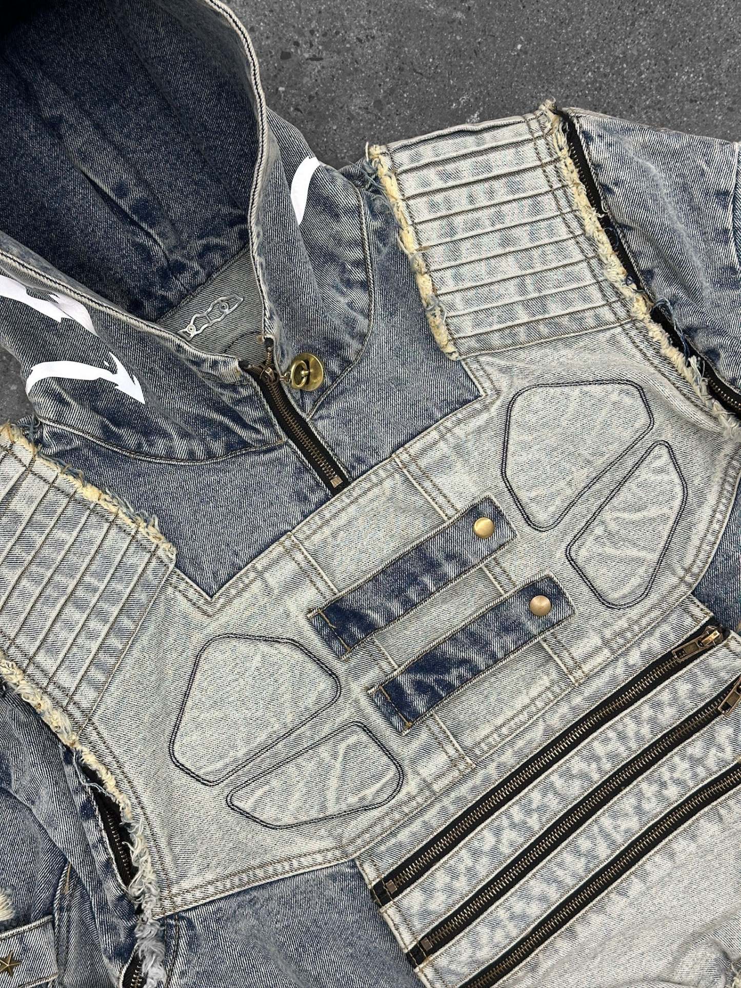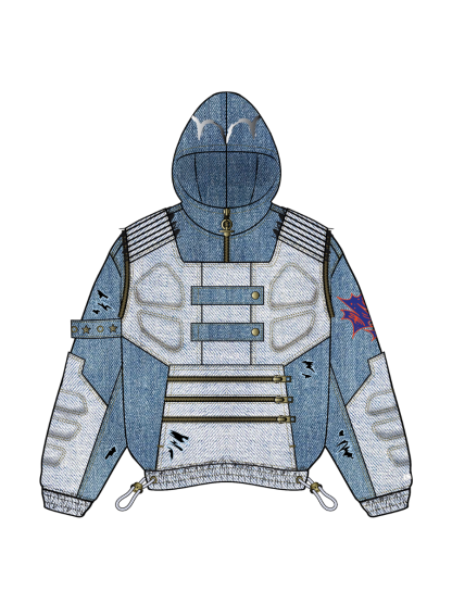 A hoodie built with a heavier presence, shaped by layered details and subtle contrast. The denim body reveals lighter reverse panels throughout the design, giving the piece a worn, battle-tested look. Detachable sleeves allow the silhouette to shift when needed, while padded armour details across the front, back, and sleeves add structure. A quarter-zip collar with a custom pull sits at the center, balanced by pleated shoulders and a studded strap running along the right arm. Reflective print on the hood, embroidered sleeve detailing, and small distressed breaks across the body give the piece texture that reveals itself the closer you look.