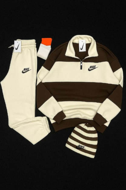 Cet ensemble Nike? comprend un sweat à demi-zip à rayures, un pantalon de survêtement assorti, un paire de chaussettes et un chapeau de laine – pour un style streetwear moderne, confortable et élégant au quotidien.
