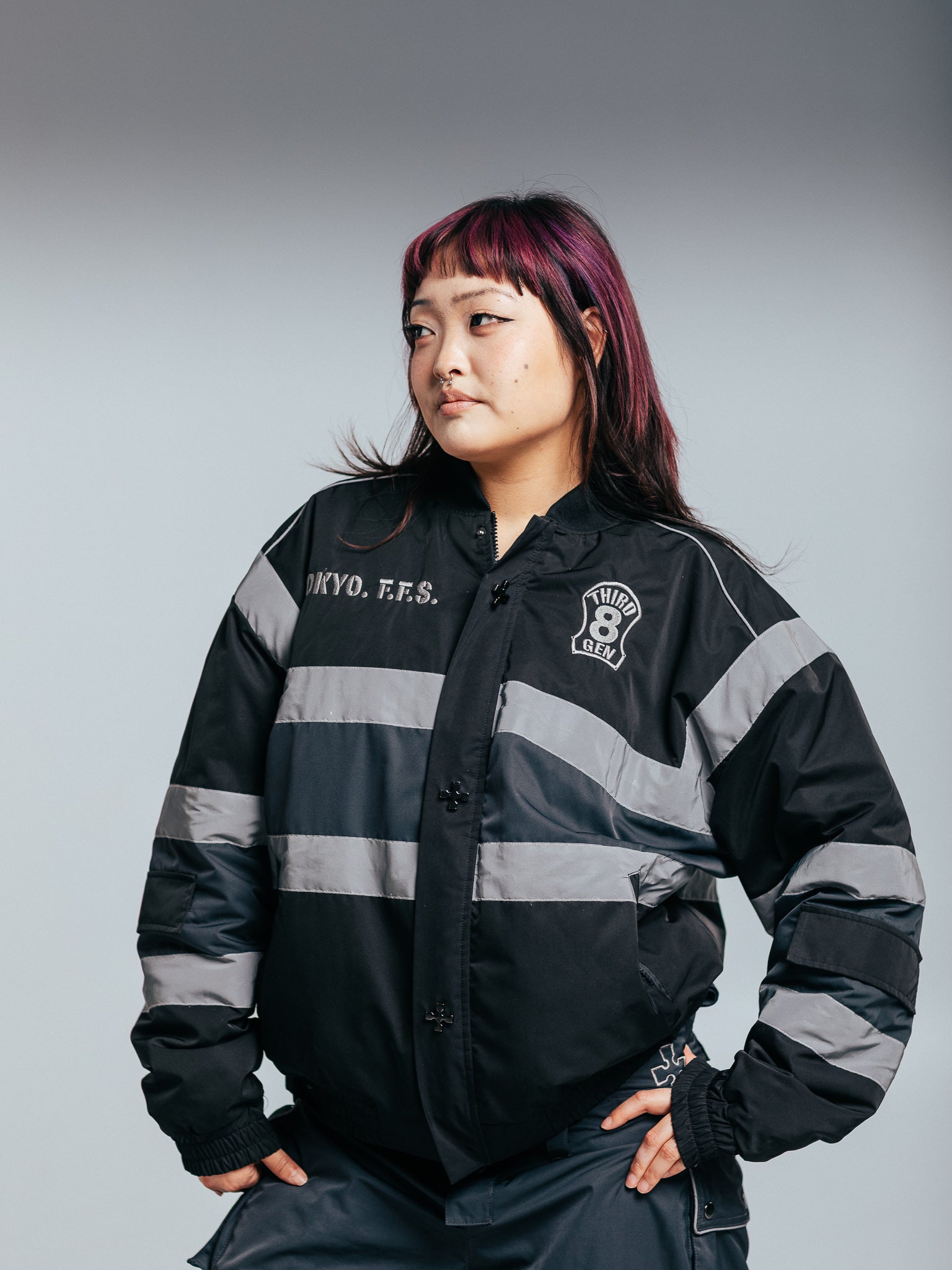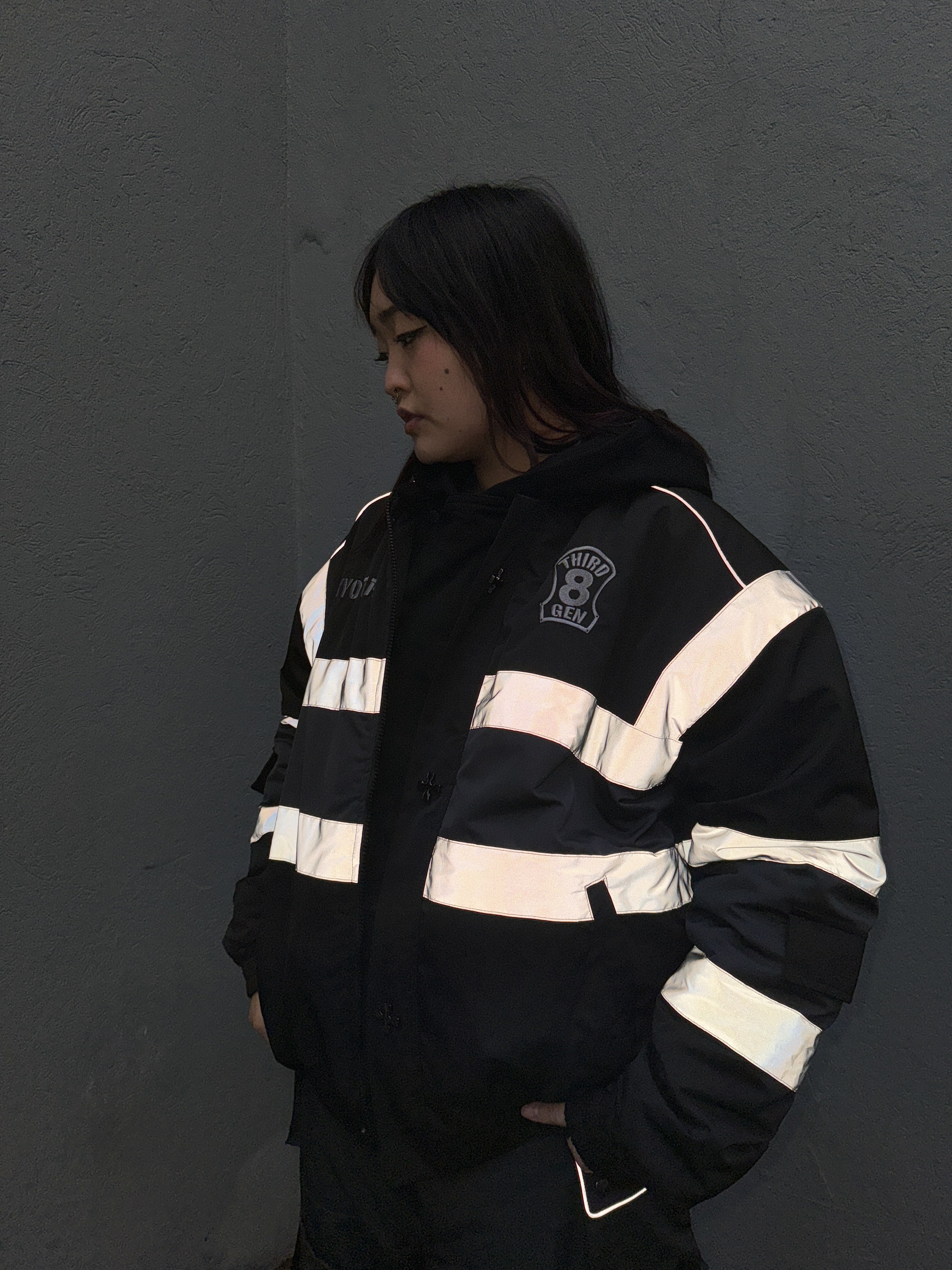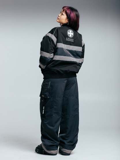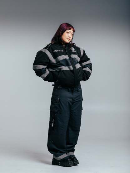 Heavyweight winter insulated jacket with embroideries on the front, back, and sleeves and a rubber patch on the back. This Jacket is made of 100% Polyester. Soft and comfortable, warm and breathable. Reflective lines reflect light and glow in the dark. Comes with backpack straps on the inside.