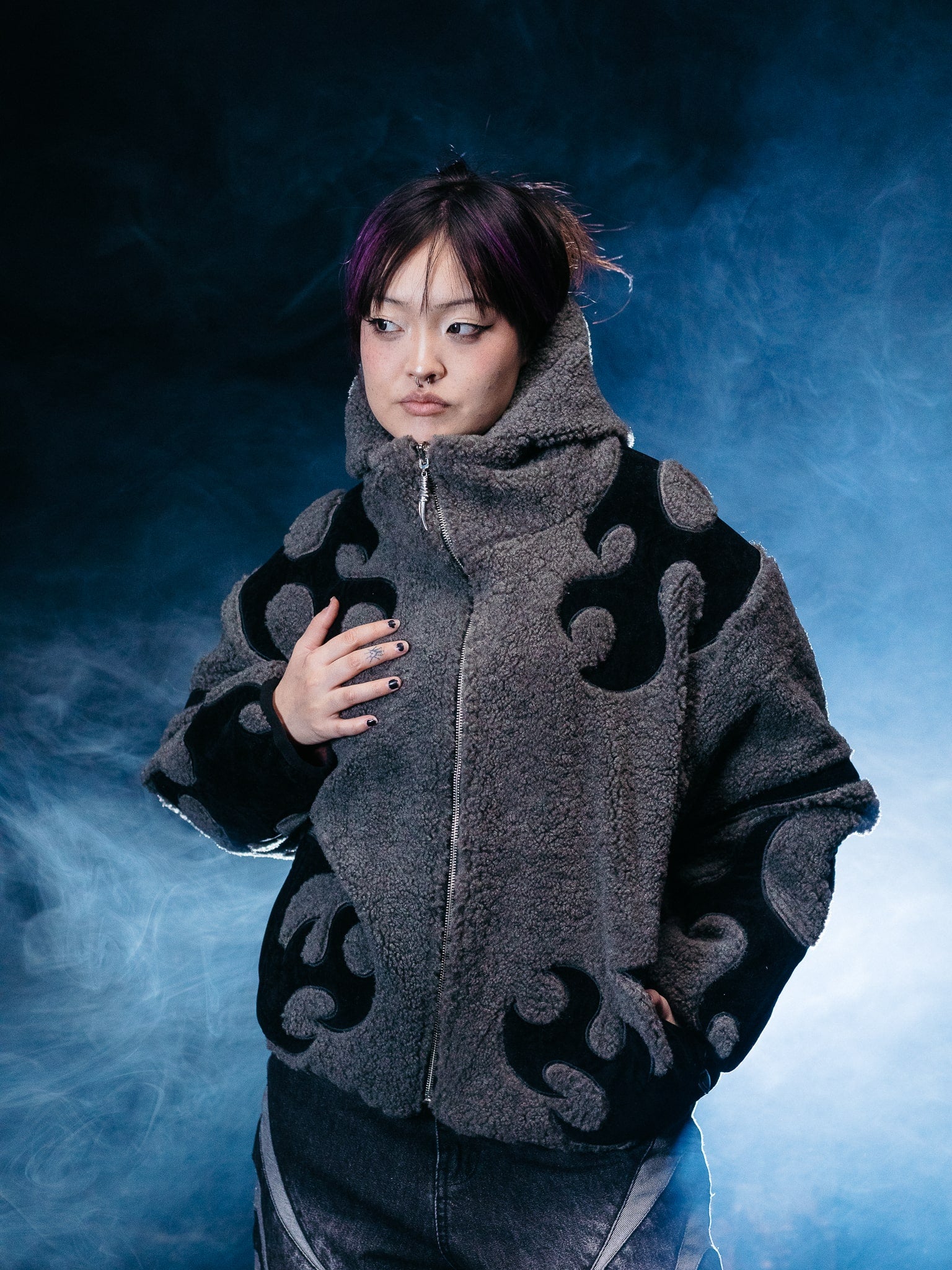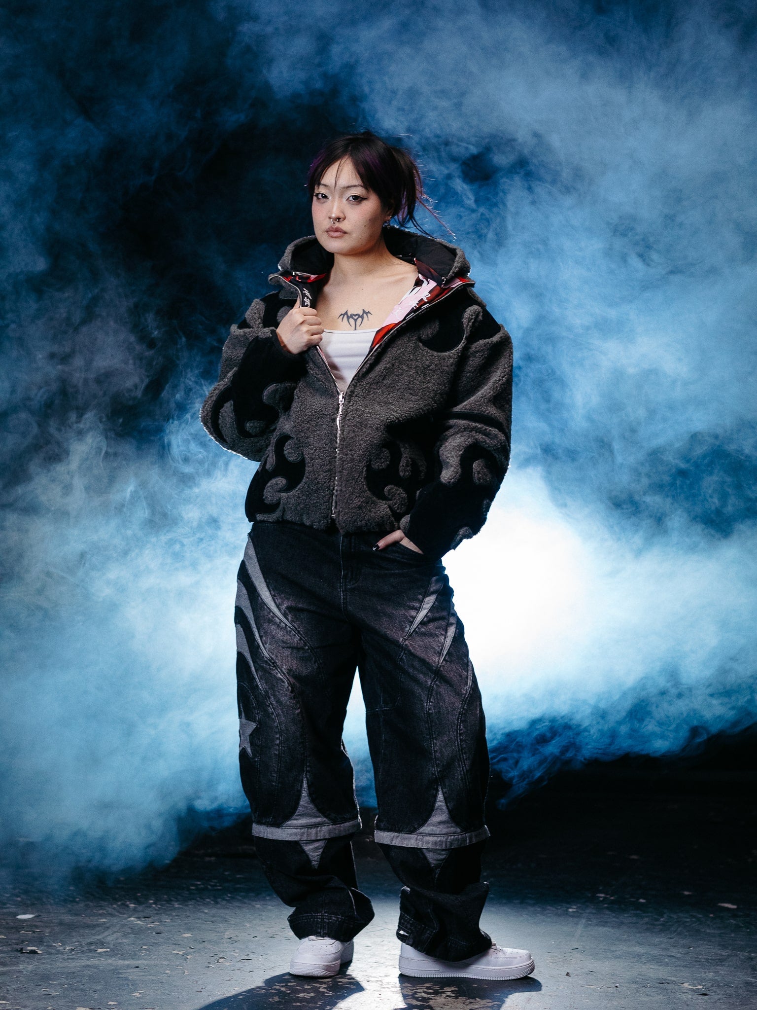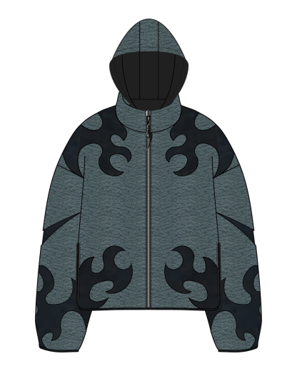 Heavyweight reversible sherpa jacket made of Teddy Fleece with embroideries on the front and sleeves. The jacket can be worn on two sides with a double-sided zipper. Comes with detachable backpack straps. The hood can be unzipped. Soft and comfortable, warm and breathable. Super Soft!