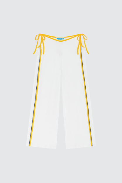 v-waistband with dropped front and back · open sides with tie-string closures · contrast binding · stretch construction